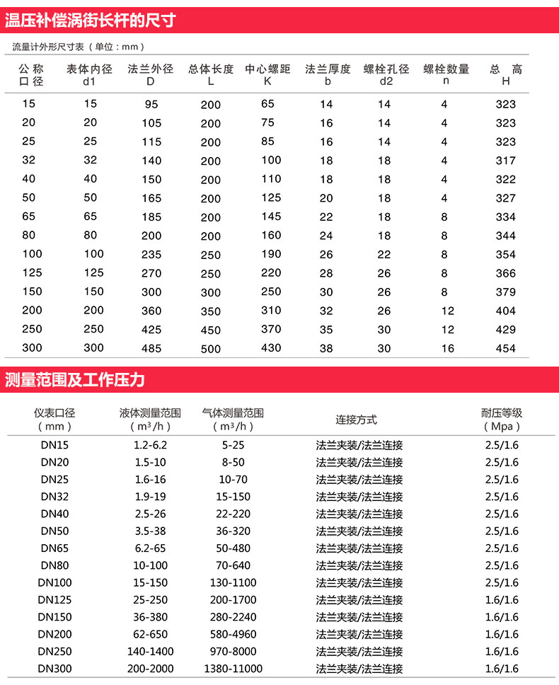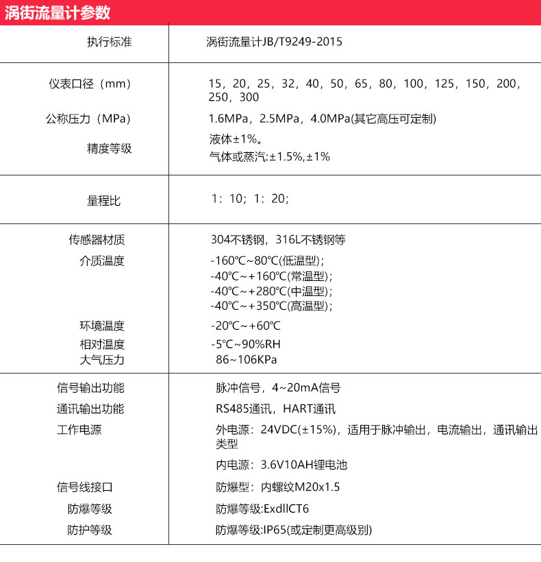 4、渦街流量計的下限流量取決于介質(zhì)的工況密度和運動粘度,其上限流量一般不受介質(zhì)壓力和溫度的影響,因此確定流量范圍只要確定實際可用的下限流量即可。計算出下限流量后,查流量范圍表即可確定相應(yīng)口徑。