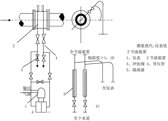 測量蒸汽流量時,安裝方式一般為差壓變送器低于、高于節(jié)流裝置兩種。取壓口位置應(yīng)附合上述安裝要求,并在導壓管制高點處裝上放氣閥和氣體收集器。