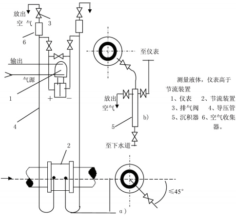 測量液體流量時工藝管道水平安裝,差壓變送器的位置 處于節(jié)流裝置下方時,取壓口應(yīng)在節(jié)流裝置的水平中心 軸線下偏45°角引出,這可以消樣除由流體傳放出的氣體進入導壓管和差壓變送器。若差壓變送器處于節(jié)流裝置的上方時,除取壓口下偏<45°角然后向 上引導壓管外,應(yīng)在導壓管 上的*高點裝置集器或排氣閥。