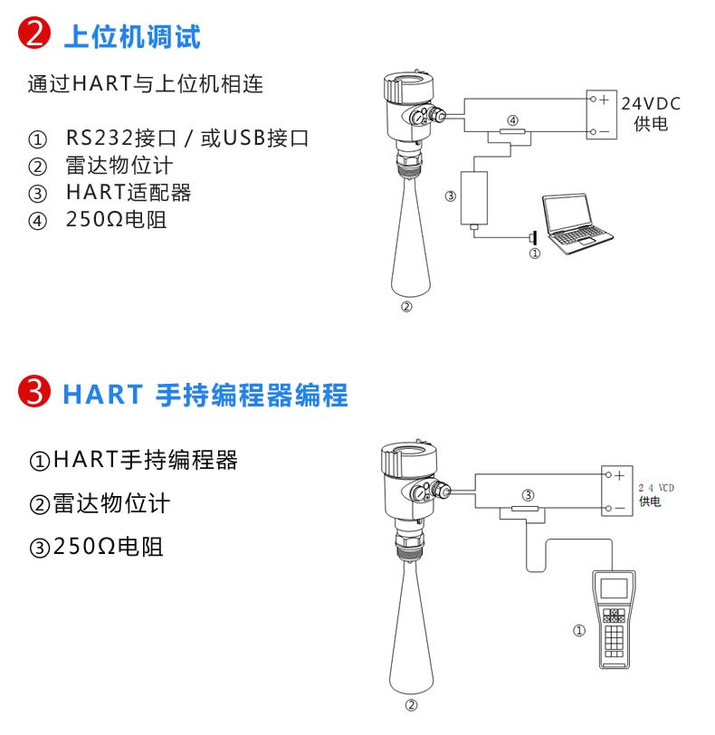 使用軟件調(diào)試的時候,給雷達儀表加電24VDC,同時在連接HART適配器前端加一個250歐姆的電阻。如果一體式HART電阻(內(nèi)部電阻250歐姆)的供電儀表,就不需要附加外部電阻,HART適配器可以和4…20mA線并聯(lián)。