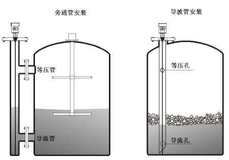 導(dǎo)波雷達物位計在含泡沫液體和攪拌罐中的丈量拾運用導(dǎo)波管或旁通管安裝,可以避免容器內(nèi)障礙物、泡沫、液體表面動搖大對丈量的影響。關(guān)于以下場所,舉薦運用導(dǎo)波管或旁通管
