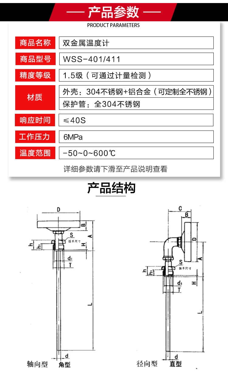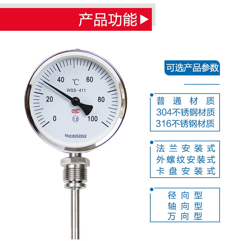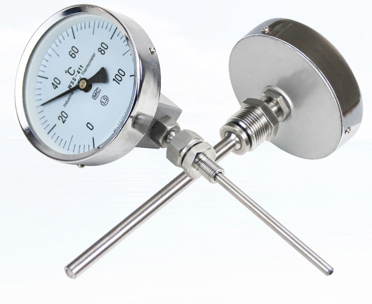 雙金屬溫度計有軸向型,徑向型,萬向型等表頭型號選擇.溫度計探桿長度可以根據(jù)客戶需要來定制?,F(xiàn)場顯示溫度,直觀方便安全可靠,使用壽命長;抽芯式溫度計可不停機短時間維護或更換機芯。軸向型、徑向型、135°型、萬向型等品種齊全,適應于各種現(xiàn)場安裝的需要。