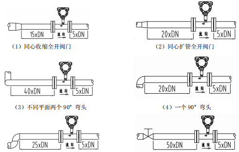 假如流量計(jì)的上游有彎頭、縮徑、擴(kuò)徑、閥門(mén)等情形,則需求更長(zhǎng)的直管段。