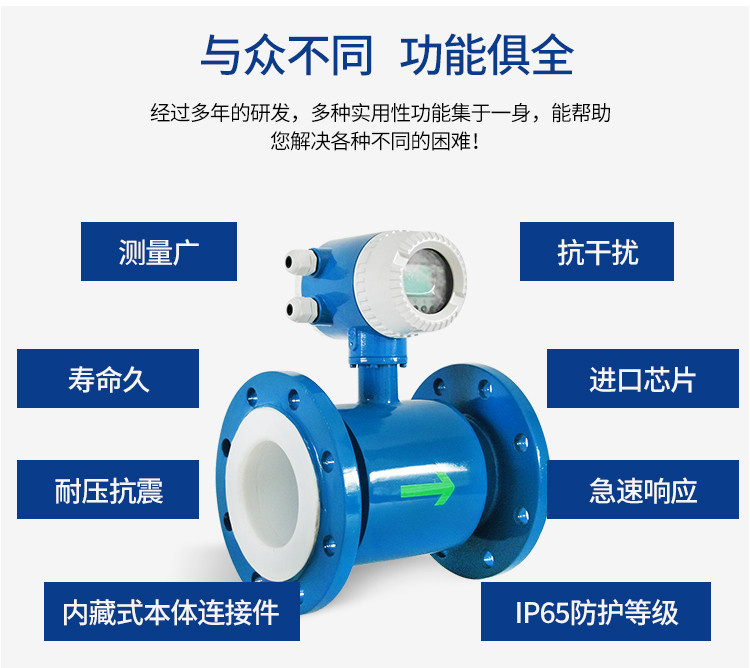 3、電磁流量計(jì)是一種體積流量測量儀表,在測量過程中,它不受被測介質(zhì)的溫度、粘度、密度以電導(dǎo)率(在一定范圍)的影響。因此,電磁流量計(jì)只需經(jīng)水標(biāo)定后,就可心用來測量其它導(dǎo)電性液體的流量。